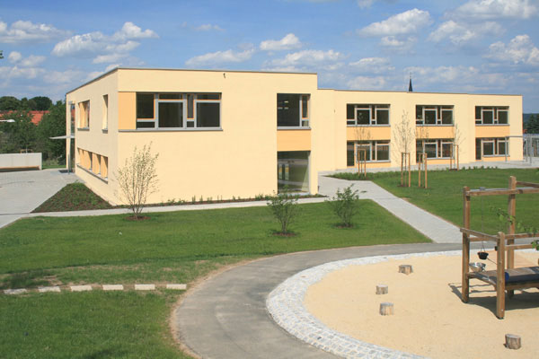 Der zweigeschossige Neubau für 135 Kinder besitzt eine kompakte wirtschaftliche Gebäudeform. Der winkelförmige Baukörper fügt sich entlang der nördlichen Grundstücksgrenze ein und erhält damit die große zusammenhängende Freifläche im Süden. Der Winkel verkürzt die Gesamtlänge, gliedert den Baukörper, begrenzt den Gartenbereich räumlich und schafft windgeschützte Terrassenflächen. Das Treppenhaus sowie die 4 Erkerfenster, die die Spielflure belichten, akzentuieren die Nordfassade. Die Energie des Heizungs- und Warmwasserbedarfs wird durch eine Luft-Wasser-Gasabsorptionswärmepumpe erzeugt.